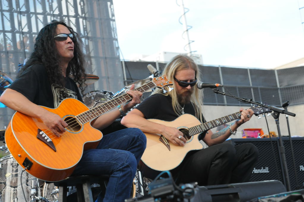 Description: Dimebag Tribute at Ozzfest 2008, Pizza Hut Park, Frisco, Texas - 08/09/08 - Scott Ian, Pearl Aday, Jerry Cantrell, Lars Ulrich, Mike Inez perform the Pink Floyd song Wish You Were Here - photos by Jeff Barringer - Club Kingsnake Staff Photographer - Photos shot with Nikon D300 and Nikkor Lenses