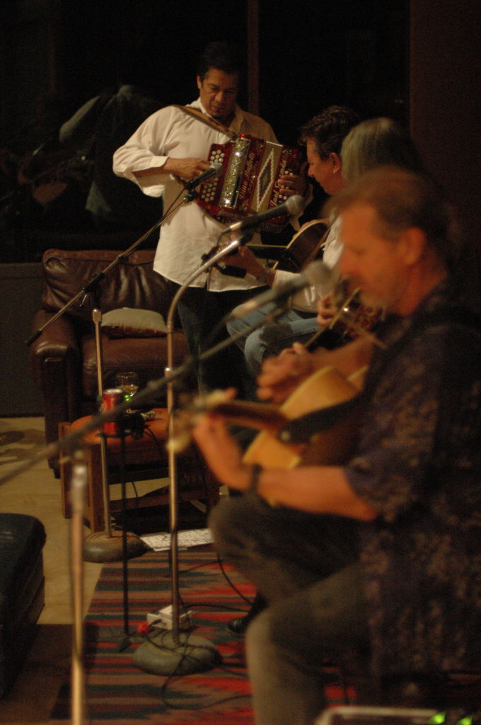 Description: The Flatlanders (Joe Ely, Jimmy Dale Gilmour, Butch Hancock, with accordionist Joel Guzman) at a house concert Austin, Texas on 6/9/07 - photos by Jeff Barringer staff photographer - Photos taken with Nikon D70 and 50mm f/1.4D AF Nikkor